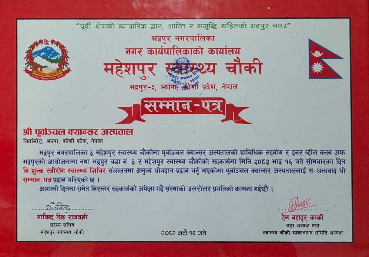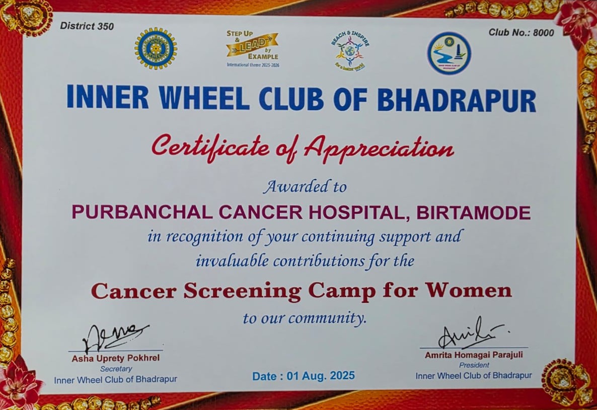 Letter of Appreciation from Inner Wheel Club of Bhadrapur